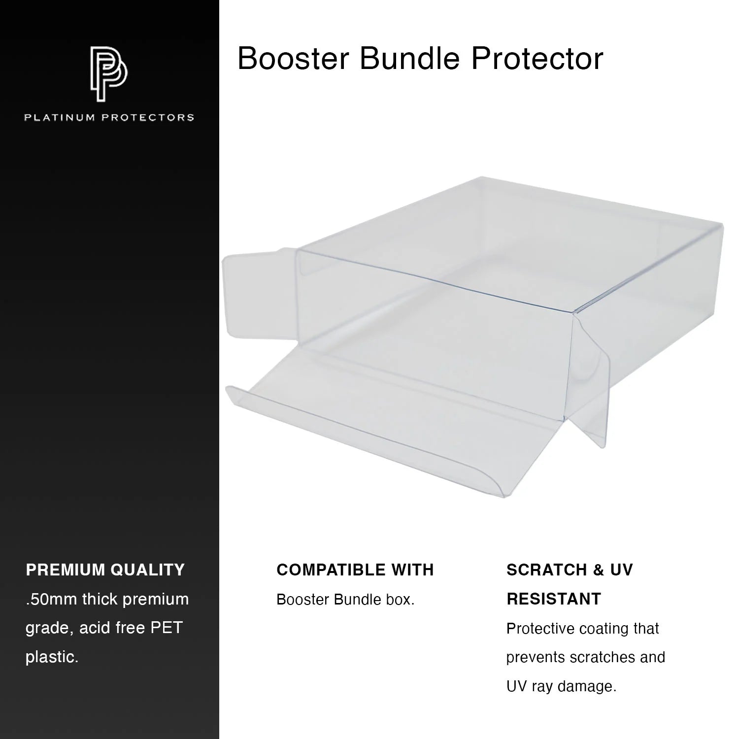 Platinum Protectors unveils its redesigned protectors for Pokemon Booster Bundle boxes. Now UV and scratch-resistant, these protectors keep your TCG boxes pristine, preventing fading and damage. With flat surfaces and sleek, softline edges, they’re easy to assemble and stack flawlessly, outshining competitors’ curved, bulky closures. Crafted from ultra-clear, acid-free PET plastic, our open-end design ensures effortless insertion, superior durability, and a premium display.